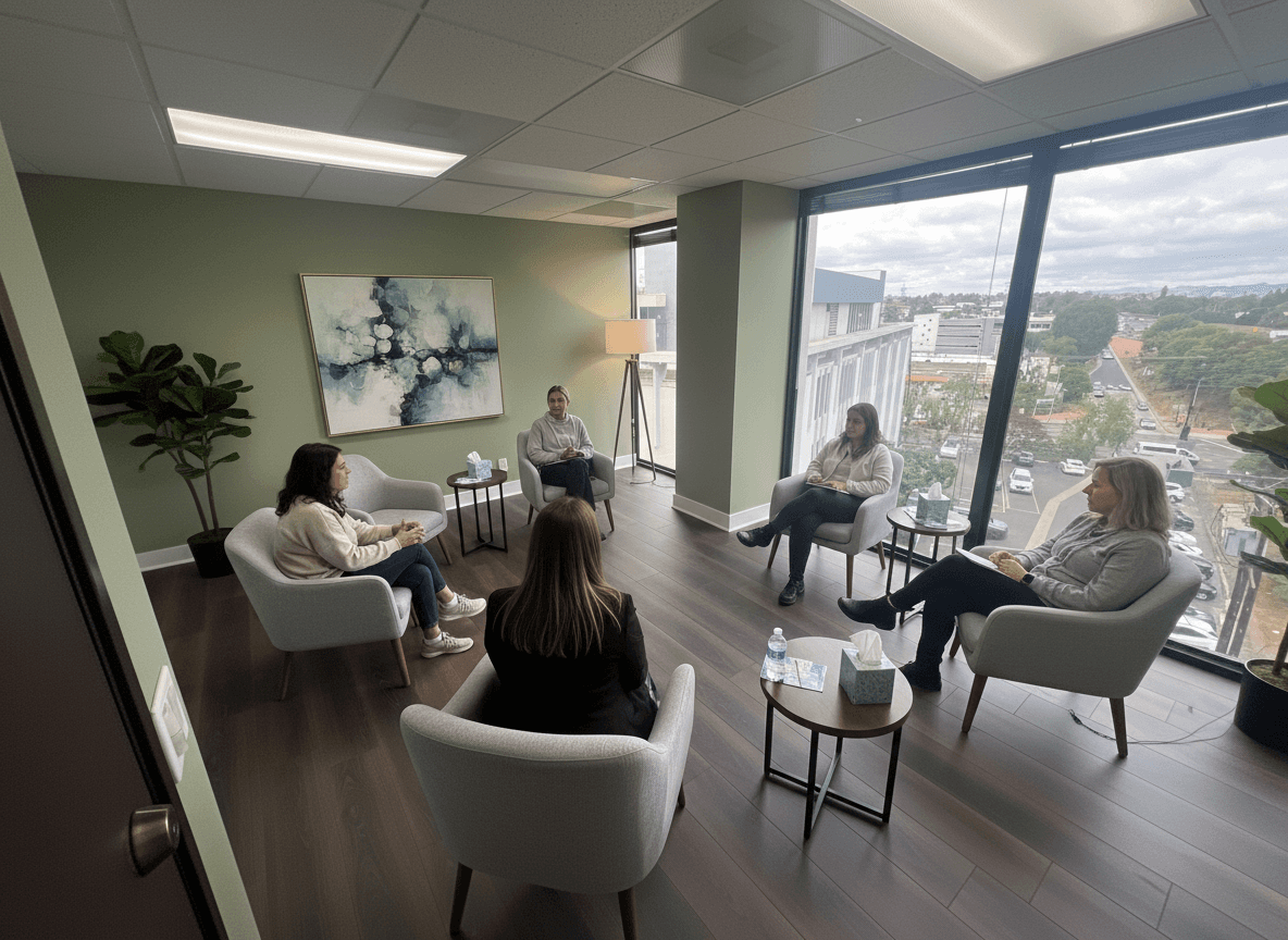 Equipped to comfortably fit up to 10 people, our two large group therapy rooms are designed for collaborative healing experiences. These spaces facilitate group sessions that foster community support, shared experiences, and collective empowerment.